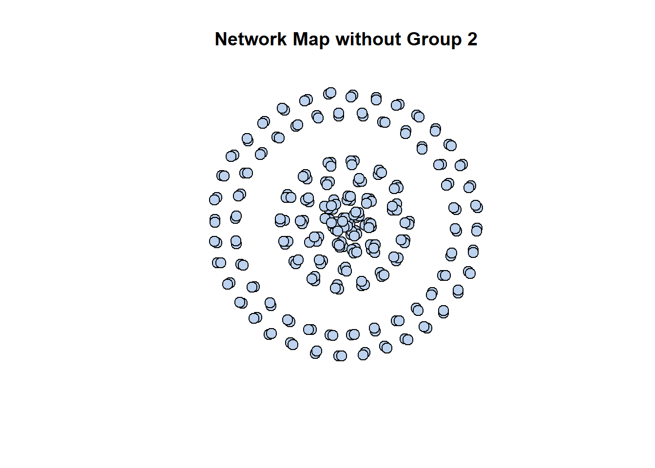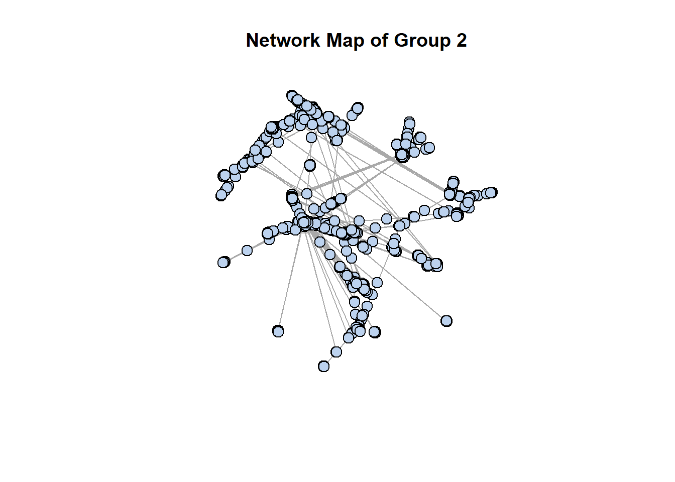 plot(subgraph,vertex.size=8, vertex.label=NA, vertex.color="lightsteelblue2", main="Network Map of Group 2")
